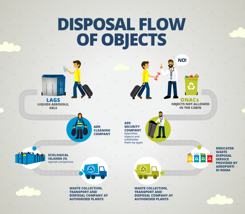 At the airport, just before the security gates, special containers are available which passengers can use to get rid of all objects not allowed in the cabin and that have not previously been placed in checked-in luggage. Aeroporti di Roma, shall subsequently dispose of this objects, namely, the LAGs* and ONACs.