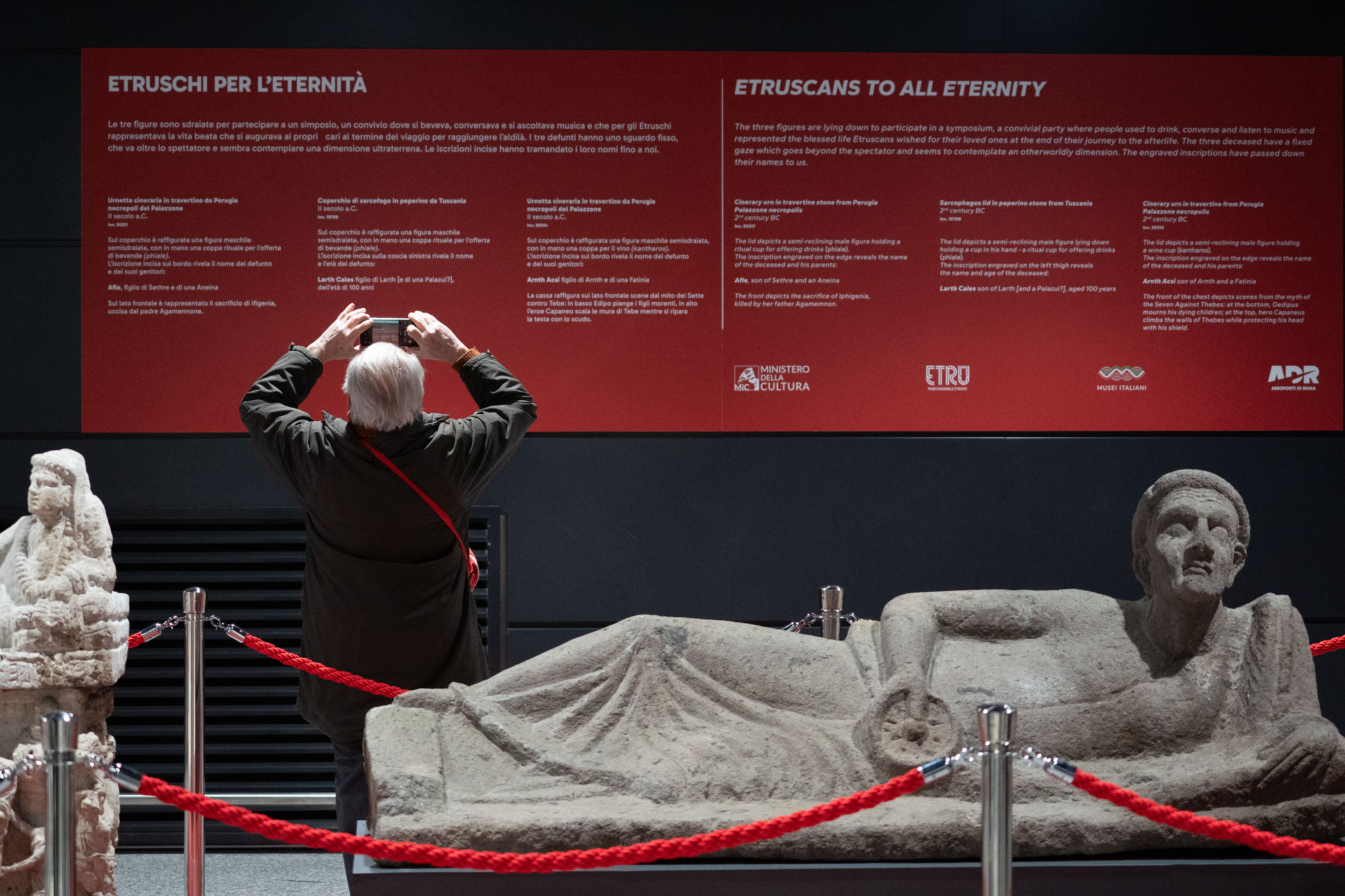 Si tratta di due urne cinerarie in travertino provenienti da Perugia e di un coperchio di sarcofago da Tuscania, che catturano l’attenzione grazie ai ritratti idealizzati di Laris Afle, Arnth Acsi e Larth Cales, uomini, probabilmente aristocratici, vissuti nel II secolo a.C. Tutti e tre i personaggi sono raffigurati sdraiati, mentre partecipano a un simposio: un ricevimento in cui si beveva, conversava ed ascoltava musica, un momento fondante della vita sociale degli Etruschi.